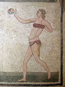 Souvent présenté comme l'ancêtre du rugby, l'harpastum est une discipline mal connue avec peu de sources littéraires et iconographiques. L'étymologie grecque du terme harpastum suggère l'interception rapide (harpazen : arracher). Si l'on en croit Athénée[1], au début du IIIe siècle, la phéninde (phaininda) est l'ancien nom de l'harpastum et les deux sports ne formeraient donc qu'un. Il est également possible que le terme phéninde fût alors celui utilisé en langue grecque tandis que les Romains lui avaient substitué celui d'harpastum depuis au moins deux siècles. Il est d'ailleurs assez délicat de faire la part des choses entre traditions grecque et latine pour ce sport, la plupart de la littérature étant en grec mais d'époque romaine. C'est la raison pour laquelle on doit souvent se contenter de description de phéninde et non d'harpastum.