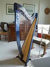 Sa colonne cintrée la rend reconnaissable entre toutes les harpes. Historiquement les cordes étaient métalliques et les deux cordes centrales étaient accordées à l'unisson. Elle possède généralement 32 à 38 cordes. De nos jours, les cordes sont le plus souvent en nylon, mais on trouve aussi des instruments montés avec cordes de bronze, en acier, en cuivre, en fibre de carbone ou en boyau (de mouton).