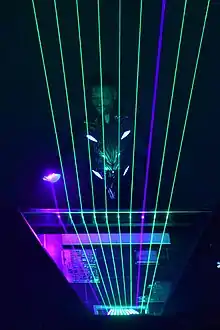Jean-Michel Jarre jouant de la harpe laser à dix faisceaux verts (dont l'un est interrompu). Chantiers navals de Gdańsk, 26 août 2005. | |