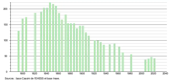 L'évolution du nombre d'habitants est connue à travers les recensements de la population effectués dans la commune entre 1793 et 1973, dans la commune associée de 1973 à 2016 et dans la commune déléguée depuis 2017. À partir de 2006, les populations légales des communes sont publiées annuellement par l'Insee. Le recensement repose désormais sur une collecte d'information annuelle, concernant successivement tous les territoires communaux au cours d'une période de cinq ans. Pour les communes de moins de 10 000 habitants, une enquête de recensement portant sur toute la population est réalisée tous les cinq ans, les populations légales des années intermédiaires étant quant à elles estimées par interpolation ou extrapolation[30]. Pour la commune déléguée, le premier recensement exhaustif, lié à celui de Colombey-les-Deux-Églises, entrant dans le cadre du nouveau dispositif a été réalisé en 2006[31].
