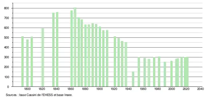 L'évolution du nombre d'habitants est connue à travers les recensements de la population effectués dans la commune depuis 1793. Pour les communes de moins de 10 000 habitants, une enquête de recensement portant sur toute la population est réalisée tous les cinq ans, les populations légales des années intermédiaires étant quant à elles estimées par interpolation ou extrapolation[27]. Pour la commune, le premier recensement exhaustif entrant dans le cadre du nouveau dispositif a été réalisé en 2008[28].