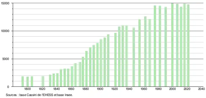 - Par convention dans Wikipédia, le principe a été retenu de n’afficher dans le tableau des recensements et le graphique, pour les populations légales postérieures à 1999, que les populations correspondant à une enquête exhaustive de recensement pour les communes de moins de 10 000 habitants, et que les populations des années 2006, 2011, 2016, etc. pour les communes de plus de 10 000 habitants, ainsi que la dernière population légale publiée par l’Insee pour l'ensemble des communes.