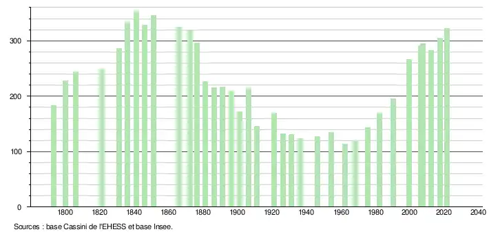 L'évolution du nombre d'habitants est connue à travers les recensements de la population effectués dans la commune depuis 1793. Pour les communes de moins de 10 000 habitants, une enquête de recensement portant sur toute la population est réalisée tous les cinq ans, les populations légales des années intermédiaires étant quant à elles estimées par interpolation ou extrapolation[17]. Pour la commune, le premier recensement exhaustif entrant dans le cadre du nouveau dispositif a été réalisé en 2007[18].
