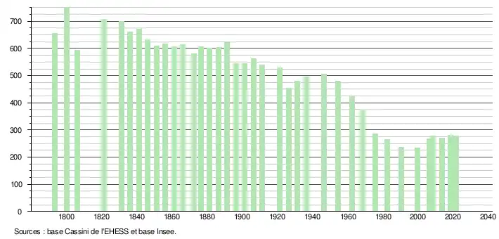 L'évolution du nombre d'habitants est connue à travers les recensements de la population effectués dans la commune depuis 1793. Pour les communes de moins de 10 000 habitants, une enquête de recensement portant sur toute la population est réalisée tous les cinq ans, les populations légales des années intermédiaires étant quant à elles estimées par interpolation ou extrapolation[24]. Pour la commune, le premier recensement exhaustif entrant dans le cadre du nouveau dispositif a été réalisé en 2008[25].