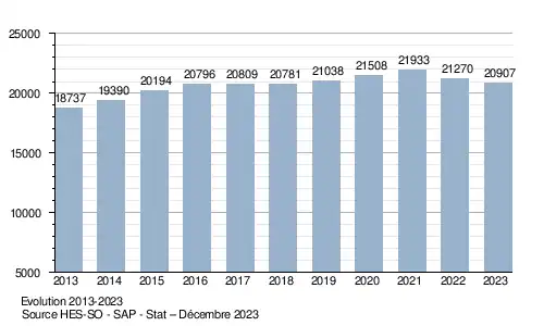 Le graphique suivant résume l'évolution du nombre d'étudiantes et d'étudiants immatriculés en formation de base (bachelor et master) et formation continue[15].