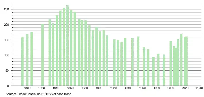 L'évolution du nombre d'habitants est connue à travers les recensements de la population effectués dans la commune depuis 1793. Pour les communes de moins de 10 000 habitants, une enquête de recensement portant sur toute la population est réalisée tous les cinq ans, les populations légales des années intermédiaires étant quant à elles estimées par interpolation ou extrapolation[19]. Pour la commune, le premier recensement exhaustif entrant dans le cadre du nouveau dispositif a été réalisé en 2004[20].