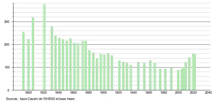 L'évolution du nombre d'habitants est connue à travers les recensements de la population effectués dans la commune depuis 1793. Pour les communes de moins de 10 000 habitants, une enquête de recensement portant sur toute la population est réalisée tous les cinq ans, les populations légales des années intermédiaires étant quant à elles estimées par interpolation ou extrapolation[22]. Pour la commune, le premier recensement exhaustif entrant dans le cadre du nouveau dispositif a été réalisé en 2004[23].