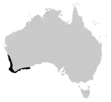 Cette espèce est endémique d'Australie-Occidentale. Elle se rencontre du niveau de mer jusqu'à 600 m d'altitude le long des côtes du Sud-Ouest de l'État et sur les îles Rottnest et Bald[1],[2].