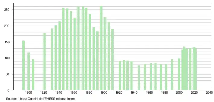 L'évolution du nombre d'habitants est connue à travers les recensements de la population effectués dans la commune depuis 1793. Pour les communes de moins de 10 000 habitants, une enquête de recensement portant sur toute la population est réalisée tous les cinq ans, les populations légales des années intermédiaires étant quant à elles estimées par interpolation ou extrapolation[19]. Pour la commune, le premier recensement exhaustif entrant dans le cadre du nouveau dispositif a été réalisé en 2004[20].