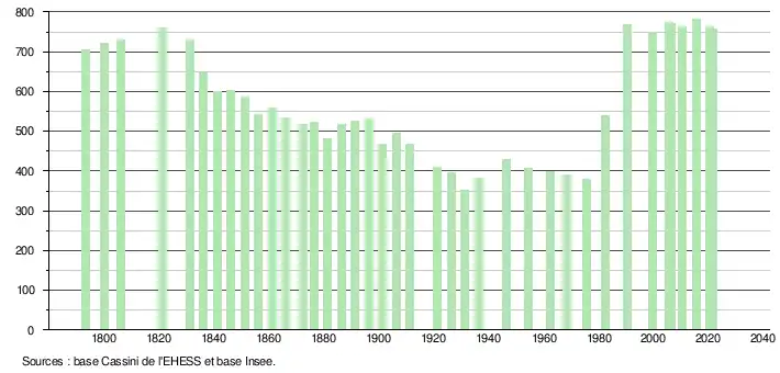 L'évolution du nombre d'habitants est connue à travers les recensements de la population effectués dans la commune depuis 1793. Pour les communes de moins de 10 000 habitants, une enquête de recensement portant sur toute la population est réalisée tous les cinq ans, les populations légales des années intermédiaires étant quant à elles estimées par interpolation ou extrapolation[19]. Pour la commune, le premier recensement exhaustif entrant dans le cadre du nouveau dispositif a été réalisé en 2005[20].