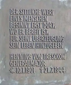 Henning von Tresckow participe l'année suivante à l'attentat du , avec Claus von Stauffenberg. Après l'échec de l'attentat, il se suicide. Il se fait sauter avec une grenade pour faire croire à une attaque de partisans soviétiques et dissimuler son implication, afin de mettre sa famille à l'abri des représailles. Cependant, la Gestapo l'a nommé « la tête de la conspiration » (dit en latin : « spiritus rector »)[4]. Après la découverte de son rôle dans l'attentat, son corps est exhumé et brûlé dans le crématorium du camp de concentration à Sachsenhausen.