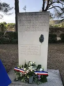 « A été fusillé par les allemands le 14 juin 1944 à Mérindol (Vaucluse) pour s'être rallié à la Résistance et avoir rejoint les Forces Françaises de l'Intérieur »