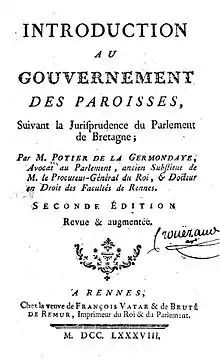 - Recueil des arrêts de règlement du Parlement de Bretagne, concernant les paroisses, nouvelle édition, Rennes, Vatar, 1777, 2 vol. in-8 ; a eu huit éditions selon Rodolphe Dareste[14].
