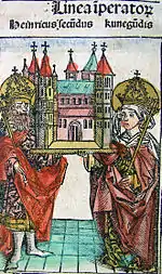 Henri II mène une nouvelle campagne en Italie en 1013 et cette fois il parvient jusqu'à Rome, où le pape Benoît VIII le couronne empereur le [9]. Il intervient comme ses prédécesseurs, dans les affaires de l'Église[10]. C’est d’ailleurs dans le domaine des relations entre l’Empire et l’Église, et dans le fonctionnement interne de l’Église que se situent ses interventions les plus significatives. Il soutient les évêques contre le clergé régulier, qui parviennent à concilier leur pouvoir séculier sur leurs territoires avec leur pouvoir spirituel. Il renforce l’obligation de célibat du clergé, de façon que les dons de terre n’aillent pas aux héritiers, ce qui lui garantit des évêques fidèles et donc un appui contre les nobles rebelles et les familles ambitieuses. Il fonde l'évêché de Bamberg en 1007, qui devient rapidement un centre de culture. En 1020, le pape consacre cette nouvelle cathédrale et le convainc de revenir pour une troisième et dernière campagne en Italie.