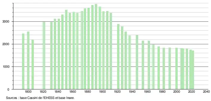 L'évolution du nombre d'habitants est connue à travers les recensements de la population effectués dans la commune depuis 1793. Pour les communes de moins de 10 000 habitants, une enquête de recensement portant sur toute la population est réalisée tous les cinq ans, les populations légales des années intermédiaires étant quant à elles estimées par interpolation ou extrapolation[28]. Pour la commune, le premier recensement exhaustif entrant dans le cadre du nouveau dispositif a été réalisé en 2008[29].