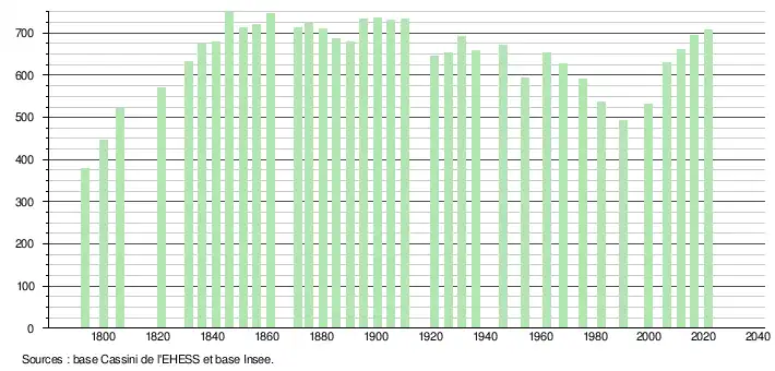L'évolution du nombre d'habitants est connue à travers les recensements de la population effectués dans la commune depuis 1793. Pour les communes de moins de 10 000 habitants, une enquête de recensement portant sur toute la population est réalisée tous les cinq ans, les populations légales des années intermédiaires étant quant à elles estimées par interpolation ou extrapolation[19]. Pour la commune, le premier recensement exhaustif entrant dans le cadre du nouveau dispositif a été réalisé en 2006[20].