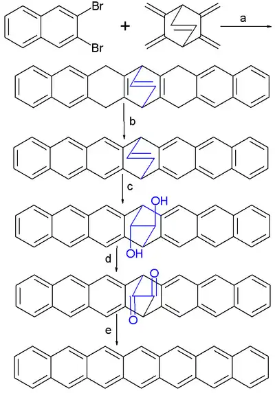 a) Réaction de Diels-Alder de dibromonaphthalène formant un aryne et du bicyclo[2,2,2]oct-2,3,5,6,7-pentaène avec du n-butyllithium dans le toluène pendant trois heures à −60 à −50 °C et 53 % de rendement chimique.