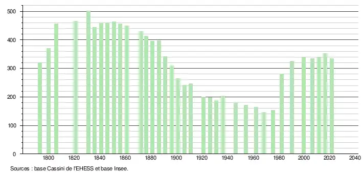 L'évolution du nombre d'habitants est connue à travers les recensements de la population effectués dans la commune depuis 1793. Pour les communes de moins de 10 000 habitants, une enquête de recensement portant sur toute la population est réalisée tous les cinq ans, les populations légales des années intermédiaires étant quant à elles estimées par interpolation ou extrapolation[16]. Pour la commune, le premier recensement exhaustif entrant dans le cadre du nouveau dispositif a été réalisé en 2006[17].
