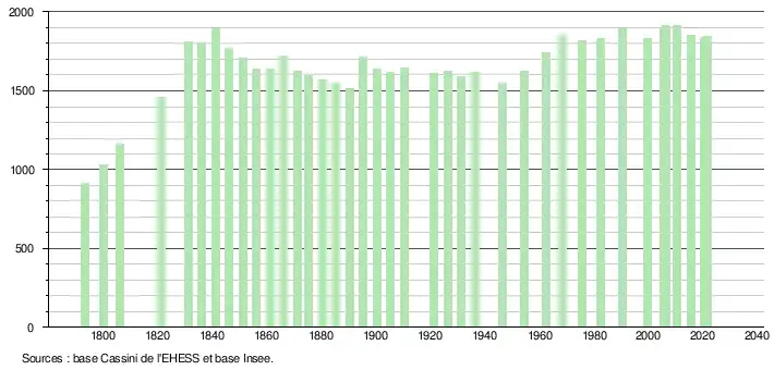 L'évolution du nombre d'habitants est connue à travers les recensements de la population effectués dans la commune depuis 1793. Pour les communes de moins de 10 000 habitants, une enquête de recensement portant sur toute la population est réalisée tous les cinq ans, les populations légales des années intermédiaires étant quant à elles estimées par interpolation ou extrapolation[20]. Pour la commune, le premier recensement exhaustif entrant dans le cadre du nouveau dispositif a été réalisé en 2005[21].