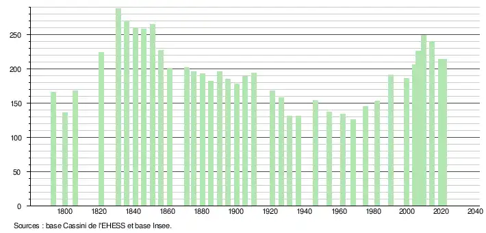 L'évolution du nombre d'habitants est connue à travers les recensements de la population effectués dans la commune depuis 1793. Pour les communes de moins de 10 000 habitants, une enquête de recensement portant sur toute la population est réalisée tous les cinq ans, les populations légales des années intermédiaires étant quant à elles estimées par interpolation ou extrapolation[20]. Pour la commune, le premier recensement exhaustif entrant dans le cadre du nouveau dispositif a été réalisé en 2004[21].