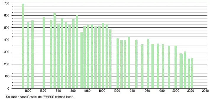 L'évolution du nombre d'habitants est connue à travers les recensements de la population effectués dans la commune depuis 1793. Pour les communes de moins de 10 000 habitants, une enquête de recensement portant sur toute la population est réalisée tous les cinq ans, les populations légales des années intermédiaires étant quant à elles estimées par interpolation ou extrapolation[29]. Pour la commune, le premier recensement exhaustif entrant dans le cadre du nouveau dispositif a été réalisé en 2007[30].
