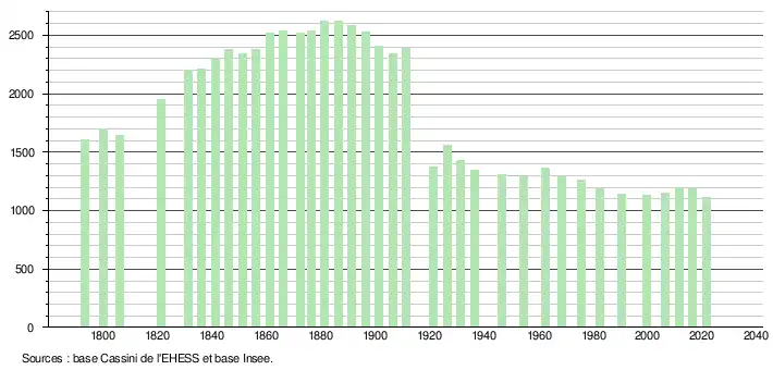 L'évolution du nombre d'habitants est connue à travers les recensements de la population effectués dans la commune depuis 1793. Pour les communes de moins de 10 000 habitants, une enquête de recensement portant sur toute la population est réalisée tous les cinq ans, les populations légales des années intermédiaires étant quant à elles estimées par interpolation ou extrapolation[25]. Pour la commune, le premier recensement exhaustif entrant dans le cadre du nouveau dispositif a été réalisé en 2006[26].