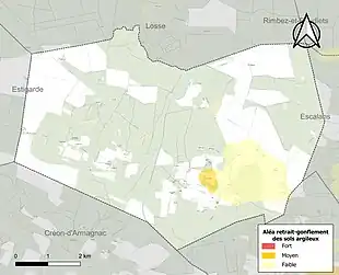 Le retrait-gonflement des sols argileux est susceptible d'engendrer des dommages importants aux bâtiments en cas d’alternance de périodes de sécheresse et de pluie. 0,7 % de la superficie communale est en aléa moyen ou fort (19,2 % au niveau départemental et 48,5 % au niveau national). Sur les 73 bâtiments dénombrés sur la commune en 2019, 4 sont en aléa moyen ou fort, soit 5 %, à comparer aux 17 % au niveau départemental et 54 % au niveau national. Une cartographie de l'exposition du territoire national au retrait gonflement des sols argileux est disponible sur le site du BRGM[21],[Carte 2].