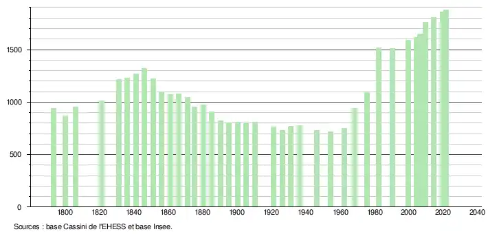 L'évolution du nombre d'habitants est connue à travers les recensements de la population effectués dans la commune depuis 1793. Pour les communes de moins de 10 000 habitants, une enquête de recensement portant sur toute la population est réalisée tous les cinq ans, les populations légales des années intermédiaires étant quant à elles estimées par interpolation ou extrapolation[16]. Pour la commune, le premier recensement exhaustif entrant dans le cadre du nouveau dispositif a été réalisé en 2004[17].