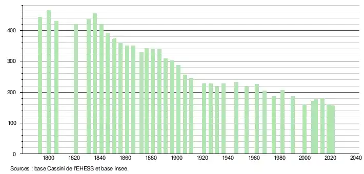 L'évolution du nombre d'habitants est connue à travers les recensements de la population effectués dans la commune depuis 1793. Pour les communes de moins de 10 000 habitants, une enquête de recensement portant sur toute la population est réalisée tous les cinq ans, les populations légales des années intermédiaires étant quant à elles estimées par interpolation ou extrapolation[32]. Pour la commune, le premier recensement exhaustif entrant dans le cadre du nouveau dispositif a été réalisé en 2008[33].