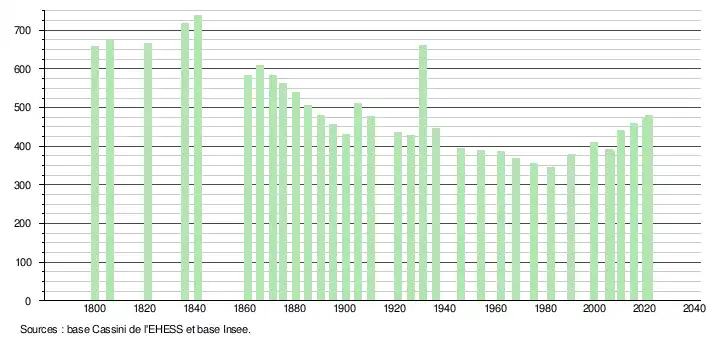 L'évolution du nombre d'habitants est connue à travers les recensements de la population effectués dans la commune depuis 1800. Pour les communes de moins de 10 000 habitants, une enquête de recensement portant sur toute la population est réalisée tous les cinq ans, les populations légales des années intermédiaires étant quant à elles estimées par interpolation ou extrapolation[18]. Pour la commune, le premier recensement exhaustif entrant dans le cadre du nouveau dispositif a été réalisé en 2005[19].