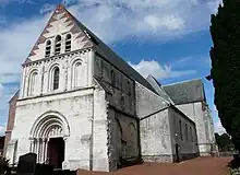- La façade romane de l'église est un vestige rare dans le nord de la France ; c'est une façade classique avec un portail en plein cintre, orné de part et d'autre de trois colonnes placées en retrait les unes par rapport aux autres ; ces colonnes sont surmontées de chapiteaux coniques sur lesquels retombent, de manière concentrique, trois moulures, réalisant ainsi une archivolte.