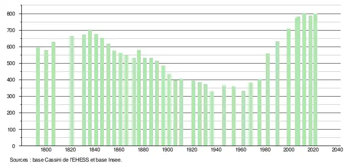 L'évolution du nombre d'habitants est connue à travers les recensements de la population effectués dans la commune depuis 1793. Pour les communes de moins de 10 000 habitants, une enquête de recensement portant sur toute la population est réalisée tous les cinq ans, les populations légales des années intermédiaires étant quant à elles estimées par interpolation ou extrapolation[21]. Pour la commune, le premier recensement exhaustif entrant dans le cadre du nouveau dispositif a été réalisé en 2007[22].