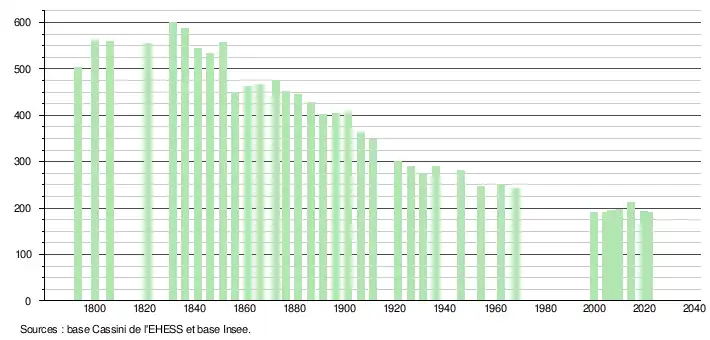 L'évolution du nombre d'habitants est connue à travers les recensements de la population effectués dans la commune depuis 1793. Pour les communes de moins de 10 000 habitants, une enquête de recensement portant sur toute la population est réalisée tous les cinq ans, les populations légales des années intermédiaires étant quant à elles estimées par interpolation ou extrapolation[14]. Pour la commune, le premier recensement exhaustif entrant dans le cadre du nouveau dispositif a été réalisé en 2004[15].