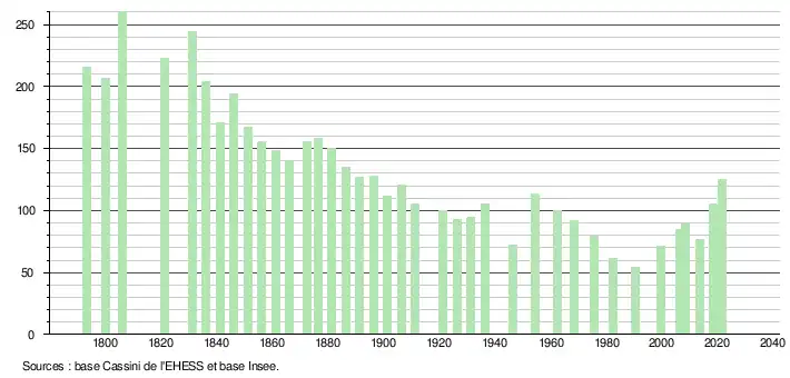 L'évolution du nombre d'habitants est connue à travers les recensements de la population effectués dans la commune depuis 1793. Pour les communes de moins de 10 000 habitants, une enquête de recensement portant sur toute la population est réalisée tous les cinq ans, les populations légales des années intermédiaires étant quant à elles estimées par interpolation ou extrapolation[23]. Pour la commune, le premier recensement exhaustif entrant dans le cadre du nouveau dispositif a été réalisé en 2008[24].