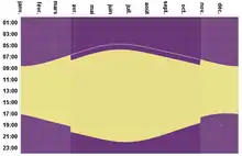 - Au-delà de la phase transitoire d'adaptation au nouvel horaire, le coucher du soleil tardif en été peut rendre l'endormissement plus difficile[31]. Ce problème se présente notamment dans les pays à heure d'été double[32] (et dans les pays nordiques).