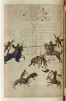 Le livre d'heures est rédigé à l'usage dominicain. Probablement composé d'un seul volume à l'origine, il en comporte deux depuis son changement de reliure à la fin du XVIIIe siècle. Il contient 7 miniatures à pleine page et 31 miniatures sur une demi-page, réparties en trois grands cycles : la Passion (8 miniatures), la vie de la Vierge (16) et le roi David (7). De nombreuses scènes marginales mettent en scène un tournoi ou une chasse. Une joute se déploie sur une pleine page (f.132v.)[1].