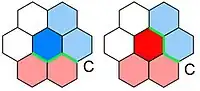 Le sommet C ne peut être atteint par la ligne verte. Pour s'en rendre compte, il suffit d'imaginer que l'hexagone du tablier connexe au sommet C est bleu foncé, illustré sur la figure de gauche. Cet hexagone est nécessairement à gauche de la ligne verte (parcourue dans le sens A vers C), ce qui est impossible car les hexagones situés à gauche de la ligne sont tous rouges. Si le même hexagone est rouge foncé, il est à droite de la ligne verte, ce qui est encore impossible[16].