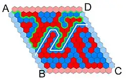 Cette ligne verte dispose de quatre propriétés qui montrent la victoire de Bleu. Il est impossible à la ligne verte de faire une boucle, un sommet ne peut être atteint qu'une unique fois par la ligne verte. Le seul motif d'arrêt est que la ligne verte a atteint un sommet extérieur, commun à deux hexagones ajoutés (en clair sur la figure). Ces deux hexagones sont nécessairement de couleurs différentes, c'est-à-dire qu'ils se trouvent sur un sommet du losange. Comme le sommet A est déjà pris, cette fin se situe sur l'un des sommets B, C ou D. Si l'on parcourt la ligne verte, depuis A jusqu'à sa fin, sur la proximité droite de la ligne, on ne trouve que des hexagones bleus (clairs ou foncés). Sur la proximité gauche, on ne trouve que des hexagones rouges. Cette propriété est illustrée sur la figure.