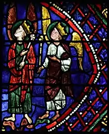 Anges de la doctrine, les Chérubins ont six ailes, entourant une tête seule, sans corps apparent (contrairement aux Séraphins) ; le tout est bleu[16]. Le vitrail de saint Apollinaire à Chartres les représente de manière atypique avec trois paires d'ailes et un corps. Dans l'iconographie chrétienne du Moyen Âge, ils sont parfois représentés avec deux paires d'ailes bleues[25],[26], contrairement aux séraphins dotés de trois paires d'ailes rouges. La principale caractéristique permettant de les identifier est que les ailes ou le corps sont couverts d'yeux.