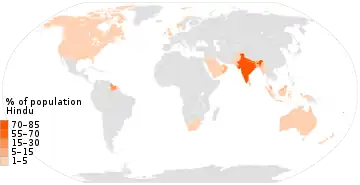L'hindouisme, parfois écrit indouisme (en hindi : हिन्दू धर्म, hindu dharm ; en tamoul : இந்து சமயம் ; « religion hindoue »), ou sanatana dharma[1] (en sanskrit : सनातनधर्म, sanātanadharma : « loi éternelle »)[2], est l'une des plus anciennes religions du monde encore pratiquées[note 3] qui n'a ni fondateur, ni dogme imposé, ni institution cléricale organisée uniformément (les brahmanes peuvent être de différentes écoles)[3],[4]. En 2015, le nombre de fidèles est estimé à 1,1 milliard[5],[6] dans 85 pays[7], c'est actuellement la troisième religion la plus pratiquée dans le monde après le christianisme et l'islam. Elle est issue du sous-continent indien[note 4] qui reste son principal foyer de peuplement.