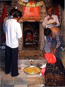 - Selon la philosophie de la Mimâmsâ, tous les devas et devîs sont les souverains des forces de la nature et des puissances en l'être vivant, en l'homme[note 10] ; « la Karma-Mîmâmsâ considère ultimement les deva comme des sons : dans le rituel, les dieux ne sont rien d'autre, en vérité, que leur nom même s'ils peuvent s'exprimer sous diverses formes plus manifestes »[57]. Pour faire en sorte qu'un désir soit réalisé, les humains doivent plaire à un ou plusieurs de ces devas et doivent les adorer avec des rites rigoureusement codifiés.
