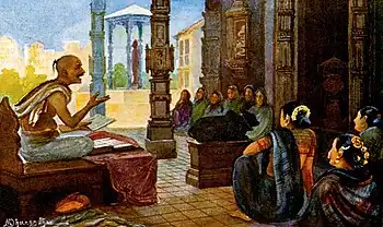 Les Védas sont les textes les plus anciens qui nous soient parvenus en langues indo-européennes. Les Védas sont considérés par les hindous comme faisant partie de la Śruti (connaissance révélée). La tradition déclare qu'ils sont directement révélés par le Brahman aux rishis alors que ces derniers étaient en méditation profonde[32],[33]. Les hymnes des Védas ont été transmis oralement de père en fils et de professeur à disciple. Par la suite, ces hymnes ont été compilés par un sage appelé Vyāsa (littéralement, le compilateur, bien que le nom puisse avoir désigné un groupe de personnes personnifiées pour les besoins de la tradition) ou encore Vedavyāsa (diffuseur des Védas)[30].