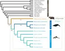 Jusqu’en 1909, les naturalistes plaçaient les hippopotames avec les cochons, en s’appuyant sur la forme de leurs molaires. Mais, par la suite, diverses études portant tout d’abord sur les protéines du sang, puis sur la phylogénétique moléculaire[56] et l’ADN[57],[58] et les fossiles, ont montré que les plus proches apparentés encore existant de ces animaux étaient les cétacés ; baleines, dauphins et marsouins[59]. L’ancêtre commun des hippopotames et des baleines a divergé des Ruminantia et des autres ongulés, puis les lignées des cétacés et des hippopotames se sont séparées peu de temps plus tard[57],[60].