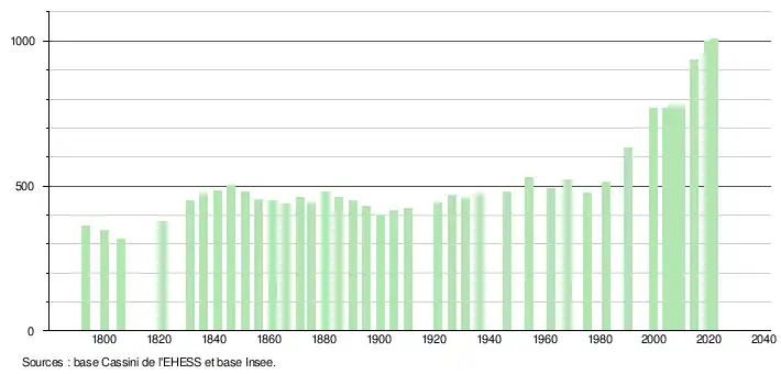 L'évolution du nombre d'habitants est connue à travers les recensements de la population effectués dans la commune depuis 1793. Pour les communes de moins de 10 000 habitants, une enquête de recensement portant sur toute la population est réalisée tous les cinq ans, les populations légales des années intermédiaires étant quant à elles estimées par interpolation ou extrapolation[18]. Pour la commune, le premier recensement exhaustif entrant dans le cadre du nouveau dispositif a été réalisé en 2004[19].