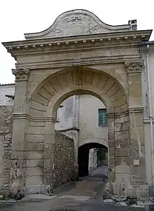 De nombreux auteurs datent de la seconde moitié du VIe siècle la construction d'une enceinte réduite[N 11] faite de blocs arrachés aux monuments romains[N 12] pour limiter le territoire à défendre en cas d'attaque. Appuyée sur la Tour des Mourgues, cette muraille rejoint directement le Rhône en s'appuyant sur l'extrémité sud du Théâtre antique. C'est également à cette époque que les arènes s'adaptent au retour de l'insécurité. Elles sont transformées en bastide, sorte de forteresse urbaine qui au fil du temps va se doter de quatre tours et dans laquelle s'intègrent plus de 200 habitations et deux chapelles.