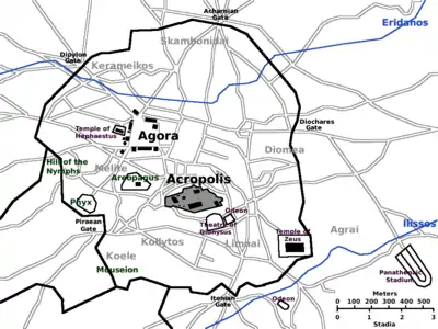 L’Athènes antique était très petite comparée à la métropole moderne : elle occupait, intra-muros, un espace de 2 km d’est en ouest et un peu moins du nord au sud. L’Acropole, par rapport au centre de la ville, se situait au sud, et l’Agora à 400 m au nord de celui-ci, dans ce qui est aujourd’hui le quartier Monastiráki. La colline de la Pnyx, où se réunissait l’Ecclesia, assemblée des citoyens athéniens, était à l’ouest. À son apogée, la ville comptait aussi des « banlieues » extra-muros allant, au nord, jusqu’à l’actuelle place de la Concorde (Omonia).