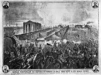 Des tractations commencèrent alors entre le Gouvernement républicain, les conservateurs et les représentants du Sultan et du Tzar, aucune de ces forces n'ayant les moyens d'imposer son point de vue exclusivement. Elles furent menées sous l'égide de Fouad Pacha, l'ambassadeur ottoman. Il en résulta un compromis sous forme d'une sorte de « régence républicaine » appelée « Locotenenţa Domnească » ("Lieutenance princière"), mais celle-ci ne fut pas reconnue par la Russie[59], et la menace d'une nouvelle guerre Russo-Turque, qui sema dans la ville la panique d'une invasion Russe, profita au bref coup d'État commis par le Métropolite Neofit contre la République[60]. Le , la foule révolutionnaire s'empara du Ministère de l'Intérieur, détruisit les listes de privilèges et de rangs des boyards et força Neofit à jeter un anathème au Règlement organique. Fouad Pacha qui était venu accompagné de troupes cantonnées à Ferentari, au sud de Bucarest, fit alors mouvement vers le nord, se heurtant sur la colline de la butte de Spirea à la résistance armée des pompiers cantonnés à cet endroit, rapidement écrasée : c'est la fin de la Révolution, car dès le lendemain, la ville est occupée et les révolutionnaires tués ou arrêtés et emprisonnés [61].