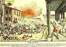Le , à l'instigation de Michel le Brave, une jacquerie des Bucarestois se traduit par le pillage et l'expulsion des usuriers (en majorité Arméniens, Grecs, Juifs et Turcs, mais tous sujets Ottomans) qui drainaient les ressources de la Valachie vers Constantinople ; quelques-uns sont massacrés. Le Sultan turc réagit immédiatement : c'est la guerre[24], Bucarest est assiégée, prise et presque totalement détruite par les forces de Koca Sinan Pacha[25]. La ville est reconstruite pendant les deux décennies suivantes, et refait surface en tant que pôle économique et politique comparable à Târgoviște sous Radu IX Mihnea (au début des années 1620)[26]. Matthieu Basarab qui a divisé son pouvoir entre Târgovişte et Bucarest, restaure les bâtiments de la Cour en ruines (1640)[27].
