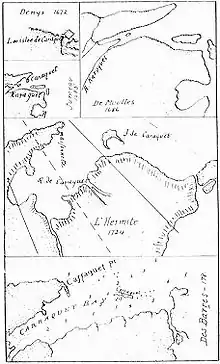 Le toponyme Caraquet est mentionné pour la première fois le lors d'un procès en France opposant deux groupes de pêcheurs se disputant l'utilisation du port[2]. Le gouverneur Nicolas Denys mentionne le toponyme Caraquet, en 1672, dans son livre Description géographique et historique des côtes de l'Amérique septentrionale, avec l'histoire naturelle de ce pays[3]. Il y fait une courte description de deux îles, identifiées par erreur dans son texte comme les îles de Tousquet mais sur sa carte comme les îles de Caraquet – l'île de Caraquet et l'île de Pokesudie[3]. Les différentes orthographes utilisées au fil des années incluent Karaquet, Quaraqu, Carraquet et Caraquette[note 1].
