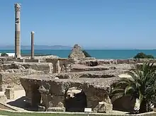 Après une escale à Chypre, Élyssa s'installe sur les côtes d'Afrique, dans l'actuelle Tunisie, avec d'autres Tyréens, dont certains sont des notables ayant abandonné la ville, et des vierges de Chypre enlevées alors qu'elles devaient s'adonner à la prostitution sacrée[22]. C'est donc un contingent hétéroclite qui serait à l'origine de l'une des plus grandes cités de l'Antiquité. La tradition la plus couramment admise date la fondation de la ville en 814 av. J.-C. Selon les traditions les plus répandues, le roi du pays, Hiarbas ou Iarbas, consentit à leur offrir un territoire « aussi grand que pourrait en recouvrir une peau de bœuf ». Élyssa, en ayant recours à une ruse punique (punica fides) découpa alors la peau en lanières dont elle entoura un territoire suffisant pour y bâtir une citadelle, les arrivants payant un tribut au roitelet local[25]. Ce territoire, appelé Byrsa (« bœuf »), deviendra le centre historique de la cité punique.